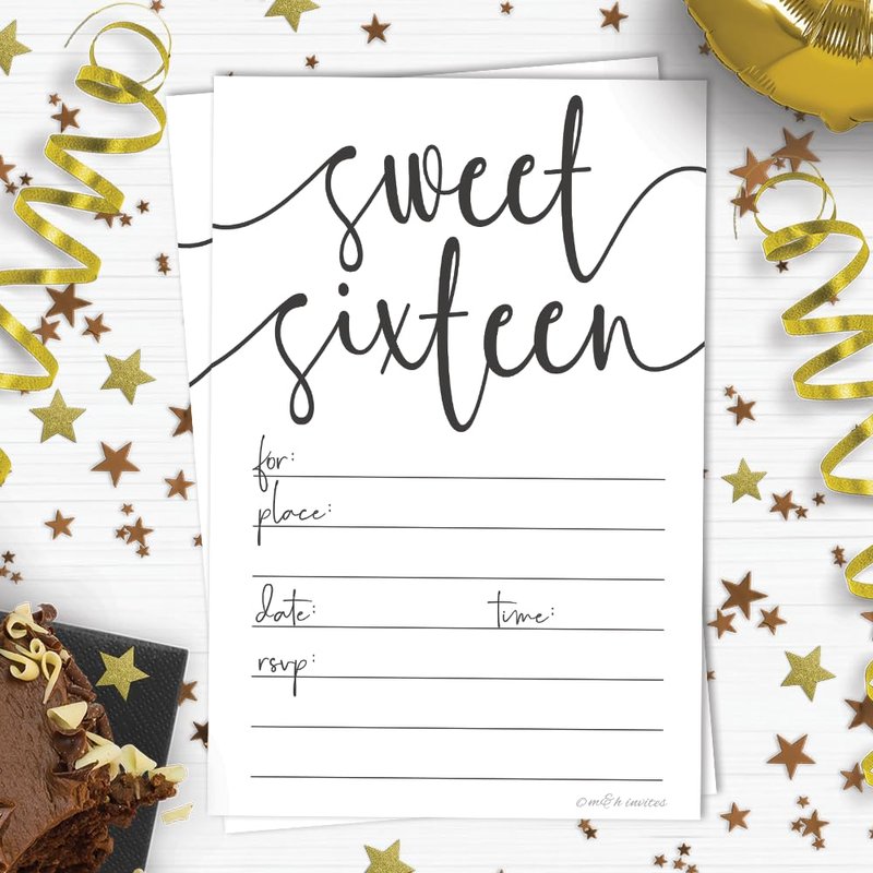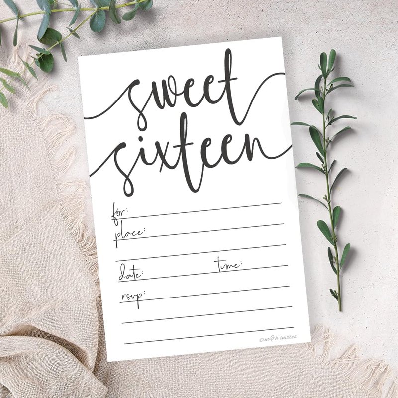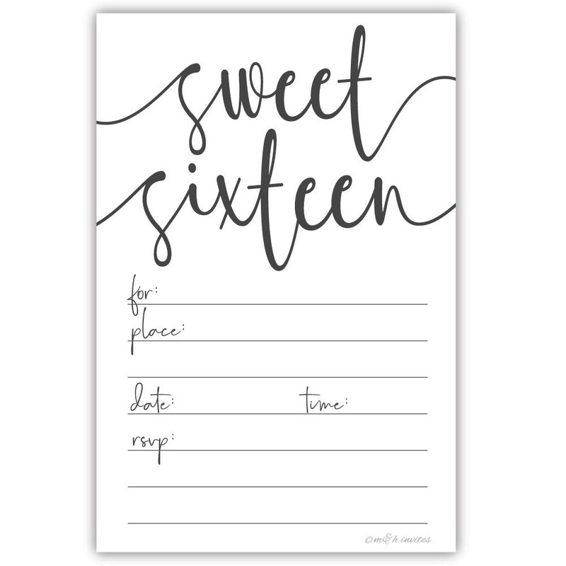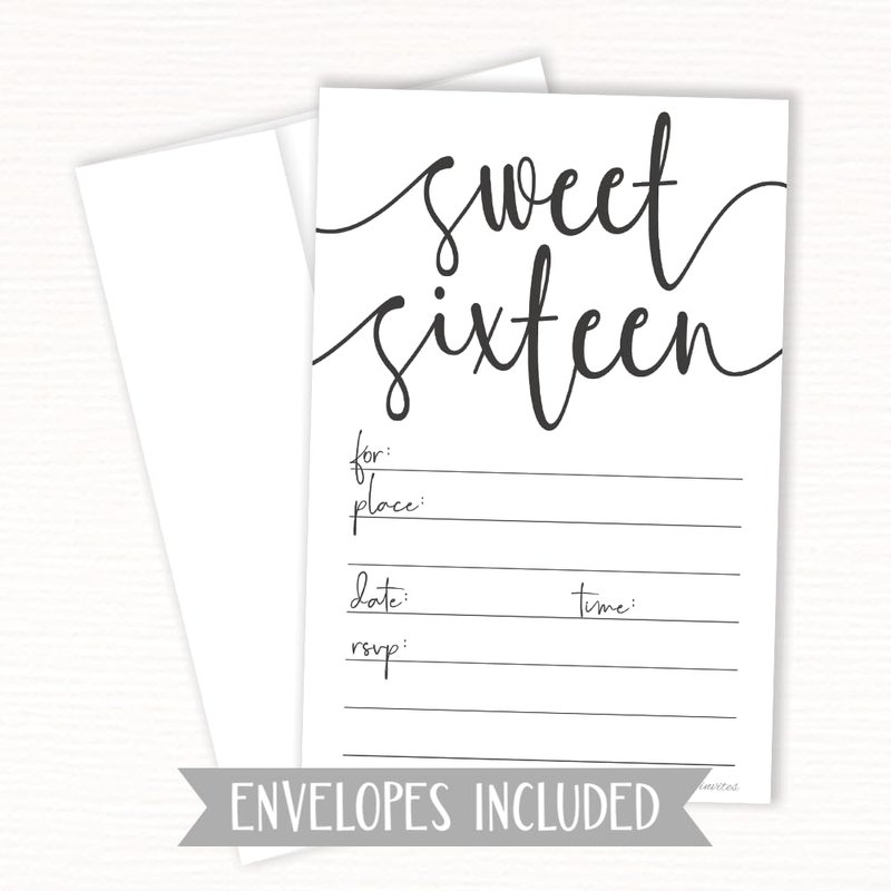Welcome your guests to your sweet 16 party celebration with these classic black and white invitations by m&h invites. Includes 20 Envelopes. Invites measure 4" x 6”. Heavy-weight matte card stock for easy fill in with many pen types.