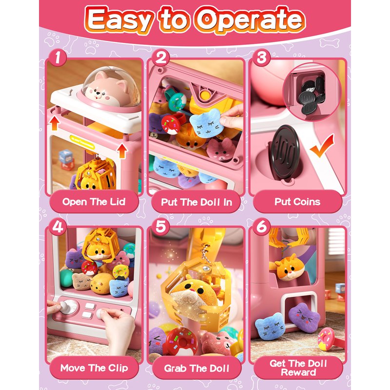 - 【More Accessories to Play】Our doggy grabbing machine equipped with 1 detachable doggy head, 10 plush toys,10 surprise eggs and 10 donut ring accessories. Our claw machine can also be filled with more diverse accessories. For example: real candy, food, trinkets or more mini dolls.