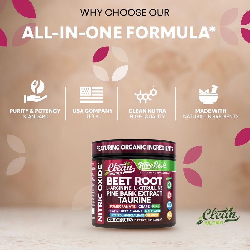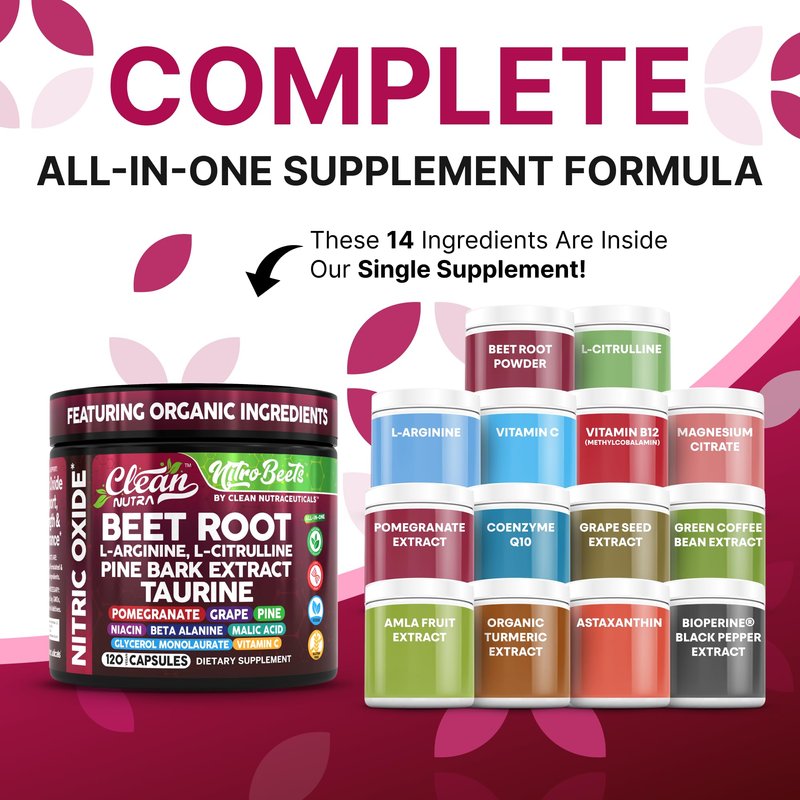 Clean Nutra Organic Beet Root Capsules L Arginine L Citrulline Pine Bark Nitric Oxide Beetroot Powder Arginine Citrulline Supplement Pre Workout Supplements Extract – 120 Vegan Pills