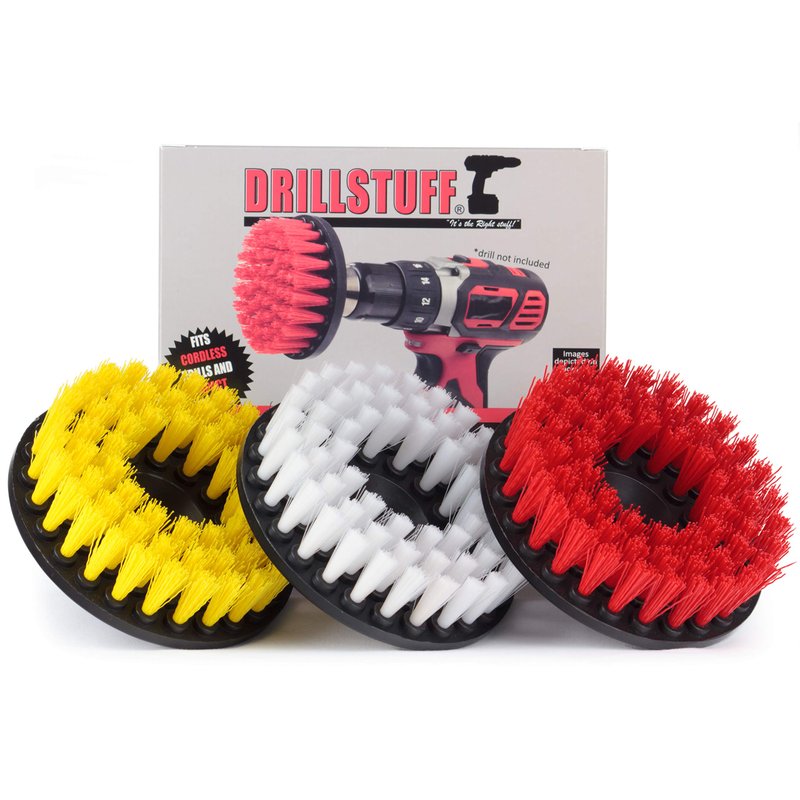 - Multi-purpose Drillbrush combo kit. Contains three 5-inch diameter power scrubbers. Includes a Red Stiff, a White Soft, and one Yellow Medium bristle cleaning brush.