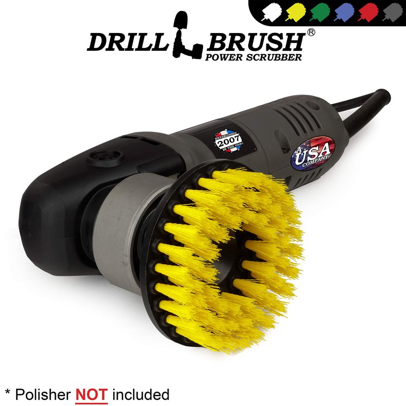 This oscillating 5 inch diameter accessory brush has a threaded 5/16x24 steel shaft to fit popular rotary polishing and DA machines including: PORTER-CABLE 7424XP, Meguiars G110v2 Polisher, Dynabrade 59040 Orbital Pneumatic-Random Orbit and similar electric and air operated dual action machines. The high speed rotation of the DA polisher combined with high quality premium medium duty bristle easily cleans Tile and Grout, flooring, and Porcelain. The yellow medium brush is meant for rigorous scrubbing of showers, tub and tile, and flooring. Cordless drill NOT included Drill NOT included. This scrub brush for cleaning showers can also be used as a toilet scrubber brush. Have that toilet looking spotless with this drill polishing brush. This shower scrub brush will restore your shower; get this power scrubber drill brush now! In the market for a bathroom cleaner because your current toilet cleaner, shower scrubber, and bathroom tile cleaner isn't doing the job our brush drill attachment brush has you covered. This Drill Brush attachment brush will become your most used bathroom gadget. Our brushes are great Deep cleaning tools perfect for removing built up soap scum or residue. Our yellow drill brush is so much more than a shower brush for cleaning, it’s a multi-purpose bathroom cleaning brush. Tired of hand scrubbing? Our rotating brushes for cleaning will save you time and effort in any bathroom cleaning job. This tile and tub scrubber cleaning brush will save you time and effort in any bathroom cleaning task you may encounter. This brush features our scrub brush drill attachment 5-inch threaded shaped brush great for cutting into large scale cleaning tasks with ease. This household cleaning brushes makes the perfect gift for any new homeowner.