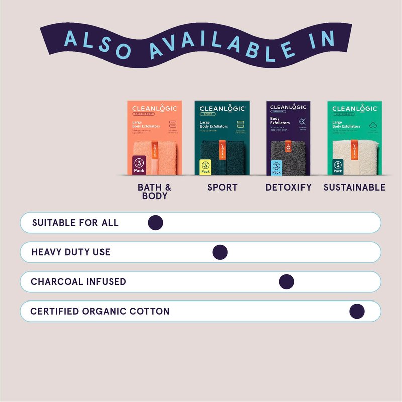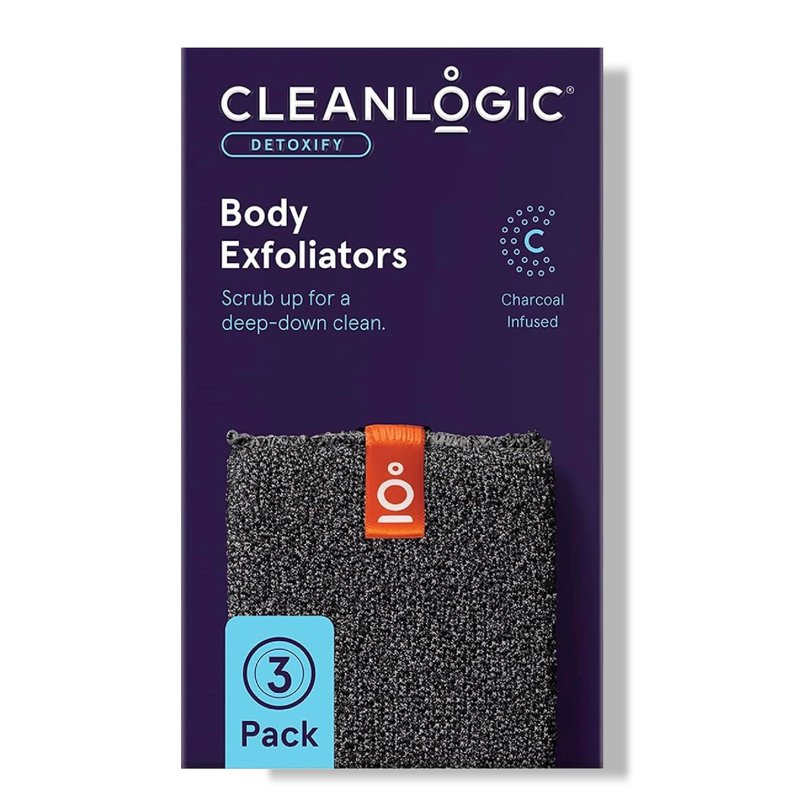 Cleanlogic Detoxify Purifying Charcoal Infused Exfoliating Body Scrubber, Reusable Exfoliator Tool for Smooth and Softer Skin, Daily Skincare Routine, 3 Count Value Pack