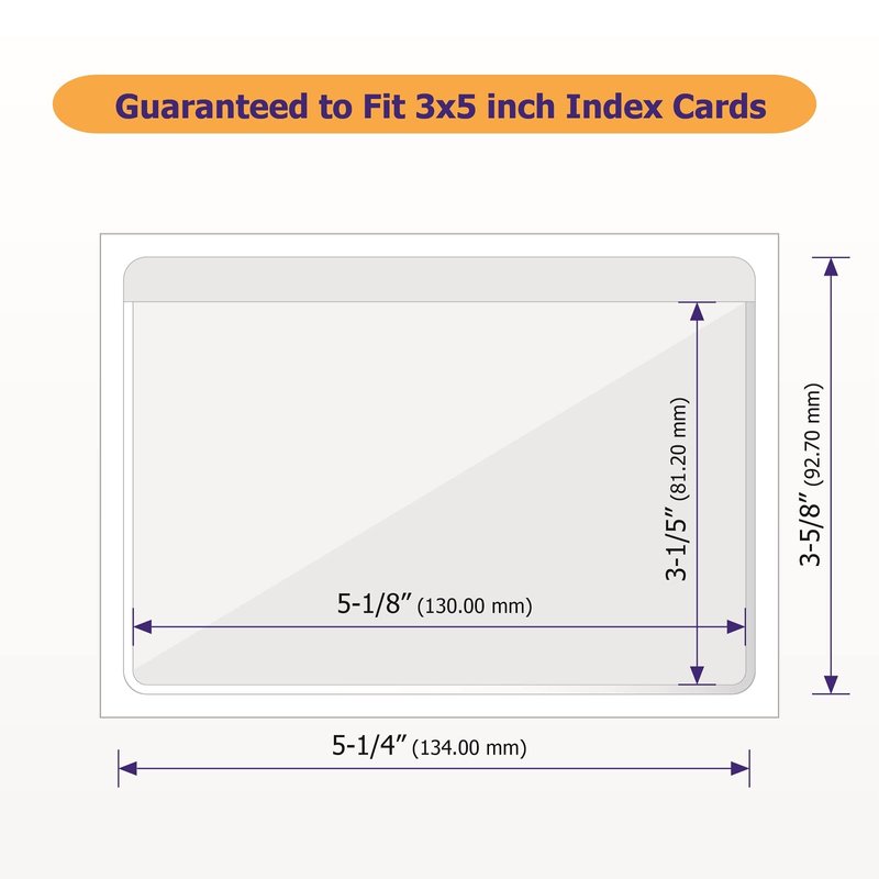 Guaranteed to Fit 3x5 inch Index Cards This product is made specifically for holding 3 x 5 inch index cards. One pocket can hold single or multiple standard index cards, heavyweight index cards, or extra-thick index cards. The Right Amount of Stickiness Easy to peel, sticks really well, won't easily lose their adhesion. You will have no problems sticking them to most surfaces. Strong, Durable Plastic Plastic pouch window won't tear, warp or wrinkle. Seams strongly welded and durable. Crystal Clear Quality Excellent pocket clarity for seeing what's inside. Versatile Design Each clear card sleeve is sized for 3x5 inserts, ideal for business cards, index cards, and preprinted labels. Self-Adhesive Each index card holder features a convenient adhesive backing, perfect for binders, bins, folders, and even notebooks! Value Set These clear adhesive sleeves come in a pack of 100, ensuring you have more than enough for storage labels, flashcard sets, and other organizational systems.
