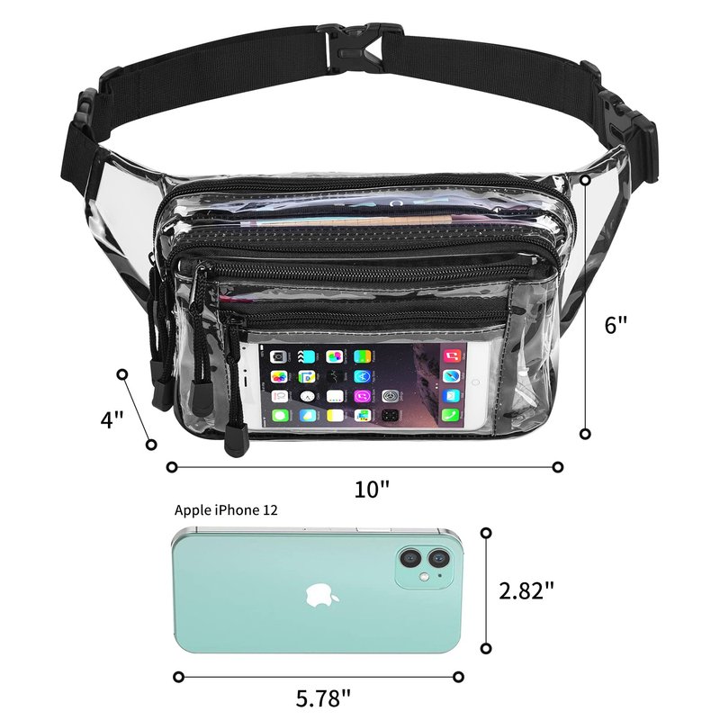 - 【 Clear Fanny Pack 】 The Fanny Pack size is about 11 x 4 x 6 inches with 5 zippered pockets suitable for most people who want to be hands free to carry the most needed items,include all size of phone, passport, keys,ID and other small items.suitable for various activities such as Shopping,Traveling,Walking,Cycling,Hiking,Holidays,Festivals and so on.