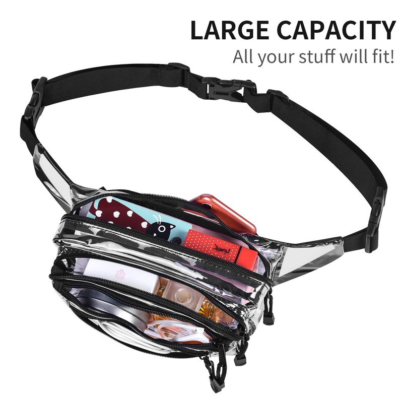 - 【Double Adjustable & Removable strap】 - See through fanny pack with 20" to 53" long adjustable strap;Great for men or women, The strap can be removed.It is water resistant. The adjustable straps around the waist are great, you have plenty of room to adjust the size and the closure clasp is sturdy.