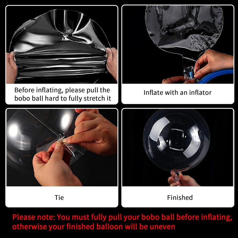 Product Details Material: TPU Size: 24 Inch 50pcs Color: ClearHow to Use1. Prepare a bobo balloon. The un-inflated balloon is small, but it becomes enormous after inflation.2. Pinch the edge of the balloon and stretch it hard twice in the horizontal and vertical directions.3. Level out and unfold the stretched bobo balloon.4. Use a helium tank or pump to inflate the bobo balloon through the inlet.5. When adding gas to the smallest marked size, slow down inflation, and then add the appropriate amount of gas until it reaches the appropriate size.6. When the wrinkles at the sides are completely unfolded, gently press down 1cm using your hand for the best effect.7. Start twisting downwards at a distance of 2 cm from the inlet.8. Tie one knot at the inlet, or tie two knots at the upper and lower parts with a string.9. Optimal inflation range.NotesIn order to rise, the balloon must be filled with helium. The bobo balloon uses imported TPU material featuring high transparency and elasticity. You can add a small amount of gas to it first, then fill it with feathers,paper scraps, color films,or smaller.balloons, etc. Afterwards, continue to inflate it until wrinkles disappear.A better inflation affect can be achieved below 28C.WarningChoking hazard Small parts.Not for children under 3 years.Package Contents50Pcs Bobo Balloons Kit