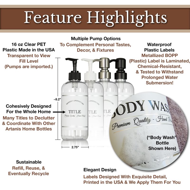 - Simple Details Have Grand Effects — Choose from an array of 4 beautiful pump options. Your plastic shampoo bottles with pump include plastic or 304 grade stainless steel pumps. Select the one that best matches your home decor. The waterproof chrome-accented labels are the finishing touch, like jewelry for your bathroom