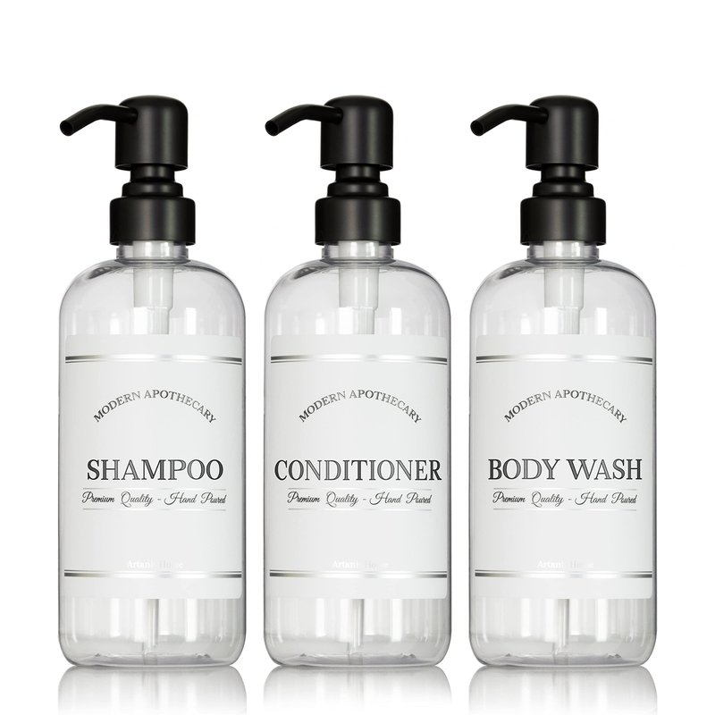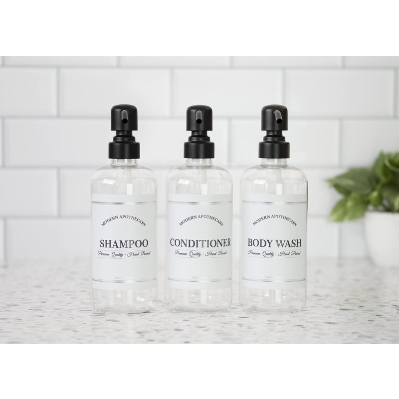 - Bring Style To Your Bathroom — Revel in the luxury of a well-organized shower. Refine your interior decor with these chic body wash, conditioner and shampoo dispenser bottles. Curate your whole home. Modern Apothecary bathroom bottles coordinate with additional matching titles for the sink, kitchen, office, and rentals. Classy, with a touch of retro flair