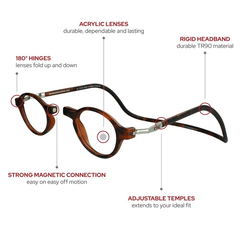 - DEPENDABLE AND DURABLE. Your CliC readers are manufactured with high-impact acrylic lenses, strong neodymium magnets, and a durable TR90 wrap-around rigid headband strap. Along with our unique 180 degree hinges that allow each lens to fold upward towards the frame or straight down around the neck. CliC glasses are built with the expectation that you'll be wearing them for years to come.