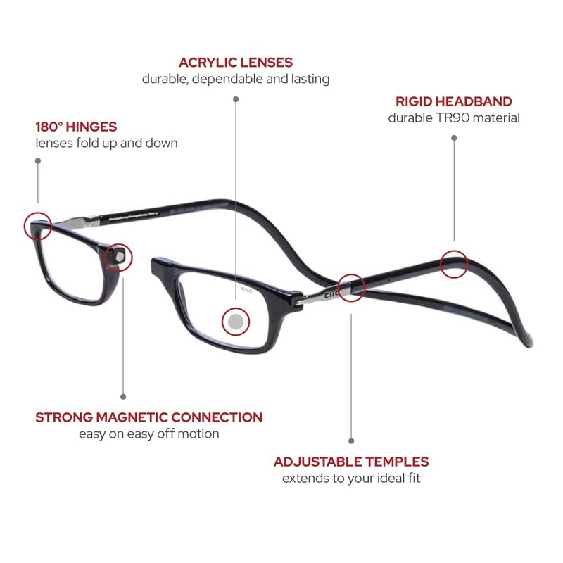 - UNMATCHED DURABILITY. Your CliC glasses are manufactured with high-impact acrylic lenses, strong neodymium magnets, and a durable TR90 wrap-around rigid headband strap. Along with our unique 180 degree hinges that allow each lens to fold upward towards the frame or straight down around the neck. CliC glasses are built with the expectation that you'll be wearing them for years to come.