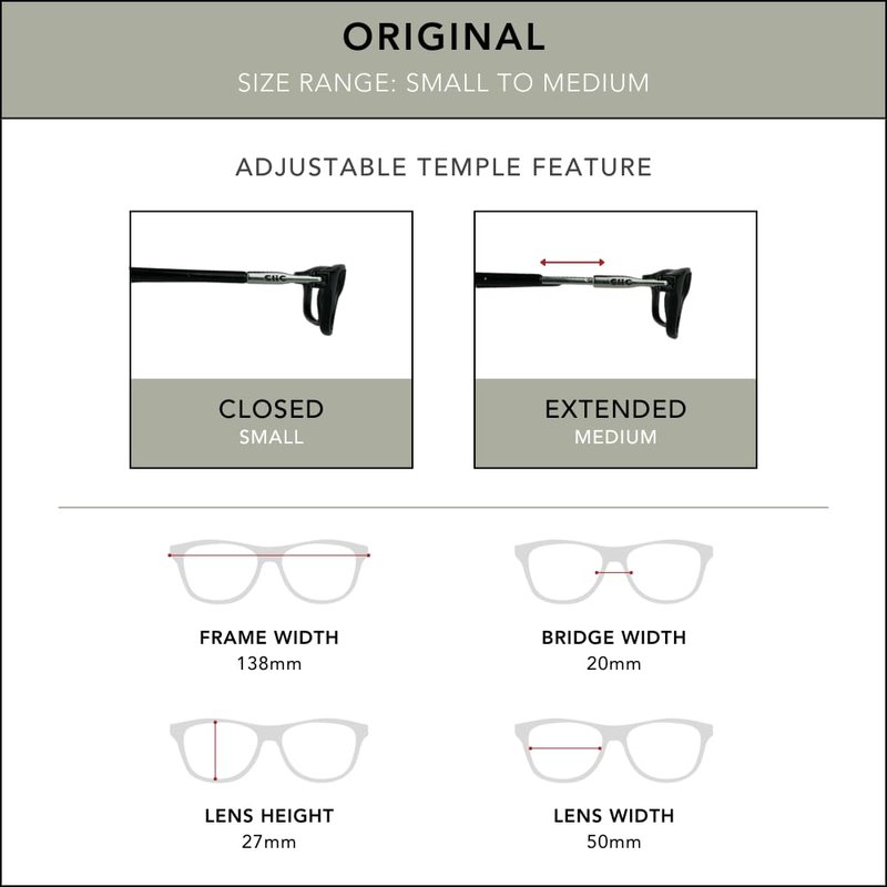 - SIZE RANGE: Small to Medium (S-M). All CliC glasses have temples that can be adjusted to fit a range of sizes. See our size chart for specific measurements.