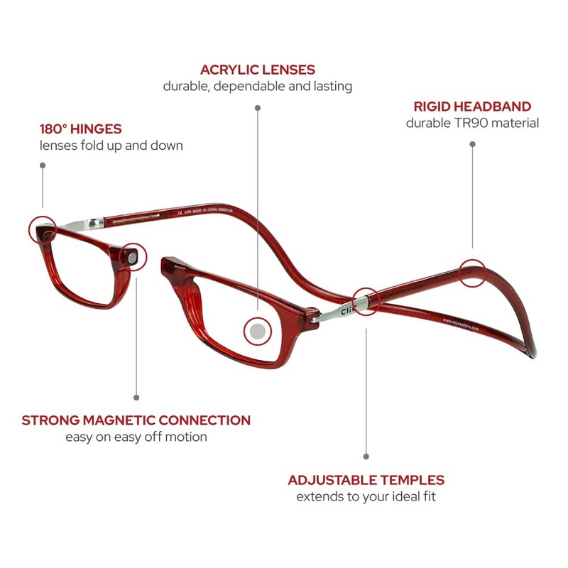 - UNMATCHED DURABILITY. Your CliC glasses are manufactured with high-impact acrylic lenses, strong neodymium magnets, and a durable TR90 wrap-around rigid headband strap. Along with our unique 180 degree hinges that allow each lens to fold upward towards the frame or straight down around the neck. CliC glasses are built with the expectation that you'll be wearing them for years to come.