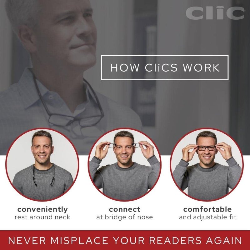 - STOP MISPLACING YOUR READERS. With CliC's exclusive front magnet connection and permanent rigid headband, taking them on and off is quick and easy. Adjust the temples for a perfect fit while wearing your glasses or have them comfortably lay around your neck when not in use. Never lose your glasses again with this built in convenience.
