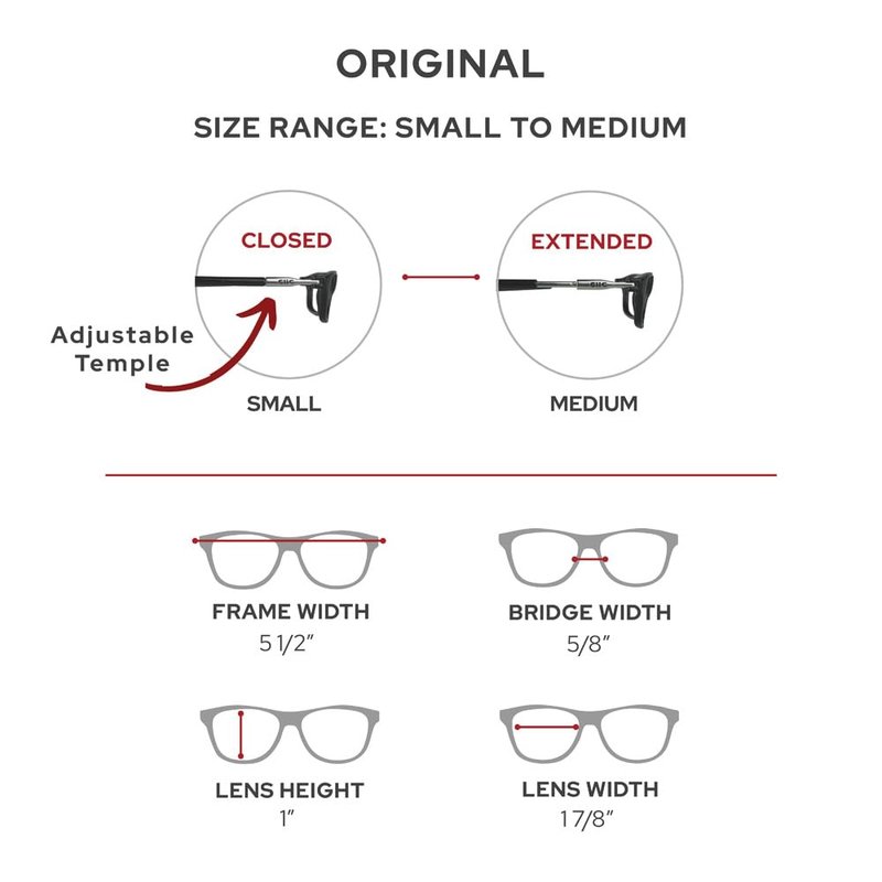 - SIZE RANGE: SMALL to MEDIUM. All CliC glasses have adjustable temples that can be fully closed or extended to fit a range of sizes. Your size is determined by measuring the full circumference of your head to account for both the frame and permanent rigid headband...see our size chart for more details.