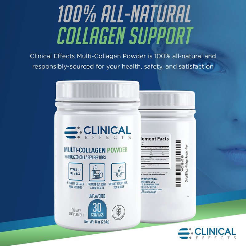 Your utmost satisfaction is our priority, that is why we at Clinical Effects use the highest quality non-GMO ingredients to formulate effective products trusted by our customers. Our formulas are developed with quality in mind, so you can always feel good about your purchase from us. Clinical Effects Multi-Collagen Powder Start the journey to support your joint and bone health, fortify the gut, and help nourish your hair, skin and nails today! Whereas most collagen products contain only 1 collagen source, the Clinical Effects Multi-Collagen Powder is a blend of 4 sources (bovine, fish, chicken, and eggs) of collagen, combining 5 collagen types (I, II, III, V, and X) into one convenient supplement. Prioritize Your Health Without chemicals and growth hormones, our all-natural, hydrolyzed Multi-Collagen Powder features a formula that’s made without gluten and dairy. All of our products are made in the USA. How to Use Add 1-2 scoops into liquids or soft foods once daily. Ingredients: Hydrolyzed Bovine Collagen, Hydrolyzed Fish Collagen, Hydrolyzed Chicken Collagen, Egg Shell Membrane. 100% Satisfaction Policy: Your satisfaction is our top priority. If you don’t think our Multi-Collagen Powder makes you happy, please contact us so we can make it right.