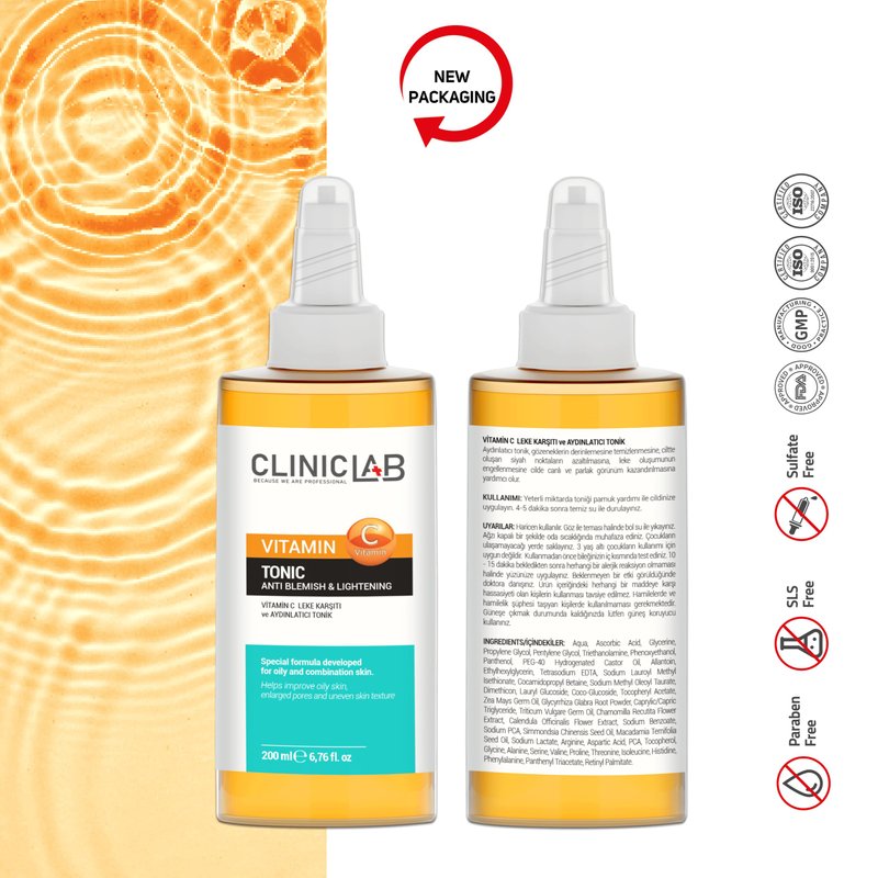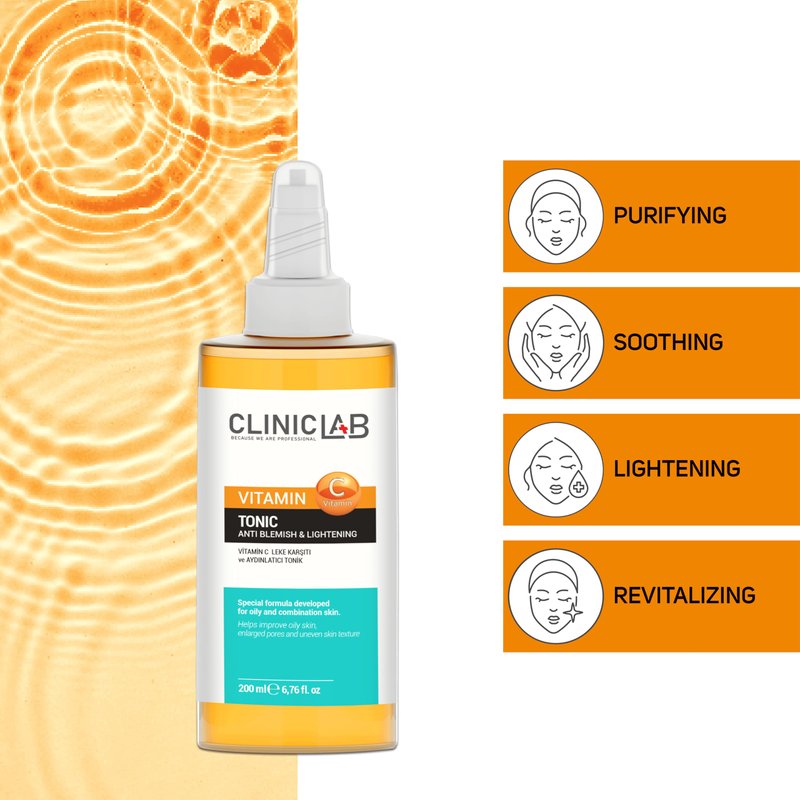 ClinicLab Vitamin C Tonic is a 200ml special formula designed for oily and combination skin. This brightening tonic deeply cleanses the pores, minimizes blackheads and black spots, and prevents the formation of new blemishes. It aims to give the skin a lively and bright appearance. To use, apply a sufficient amount of the tonic to your skin with cotton. Rinse with clean water after 4-5 minutes. This product is particularly effective for those looking to manage oily skin and achieve a more even, radiant complexion.