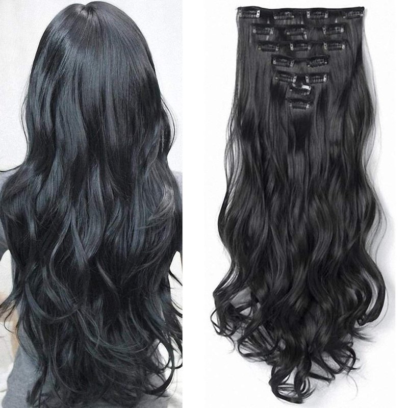 Clip in Hair Extensions for Women 7PCS Clip Ins 22 Inch Long Wavy Synthetic Thick Hairpieces Fake Hair Piece Double Weft Heat Resistant Fiber Natural Black 1B Color