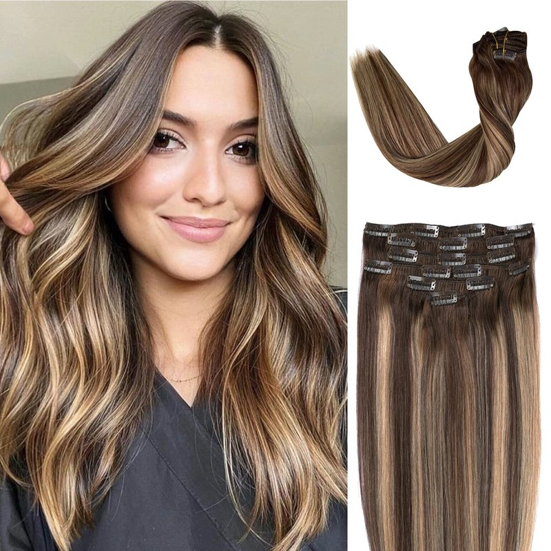 Clip in Hair Extensions, Human Hair 7Pcs 120g Clip in Extensions,Ombre Chocolate Brown to Honey Blonde Highlights Balayage Real Hair Extensions Clip in Straight Remy Human Hair Extensions 14 Inch