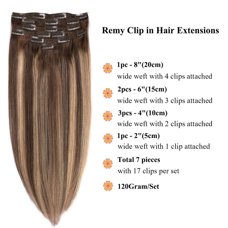 - 100% Remy real clip in human hair with same direction cuticles,No Shedding,No Tangles,No Smell,Silky Soft Thick Straight,120 Grams 7 Pieces 17 clips per set clip in hair, double strong weft,can be curled, straightened, washed, cut, dyed and restyled like your own hair .
