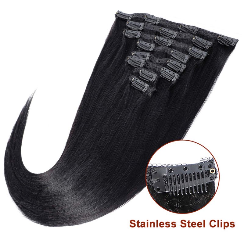- -- jet black hair extensions real human hair, 8pcs 120g with 18 clips per set, 20 Inch, #1 Jet Black. According to your own hair volume, just to thicker your hair, advice buy 1-2 sets; want to full head, advice buy 2-3 sets. When the weight is the same, the longer size will be thinner than the shorter size a feeling of.