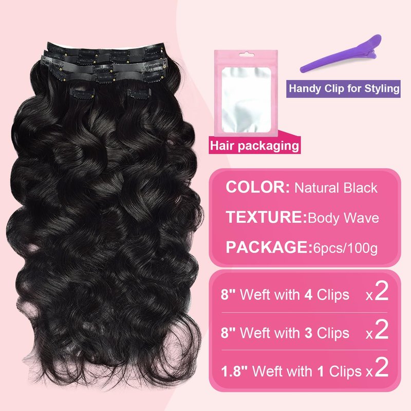 - 【 Wavy Clip In Hair Extensions】Our body wave clip hair extensions are made of high quality grade 10A virgin human hair materials, it is silky and smooth, healthy, no chemistry,no smell.curls pretty good,can be washed, permed, cut,easy to care. Beautiful texture, bouncy, natural good for short and thin hair.