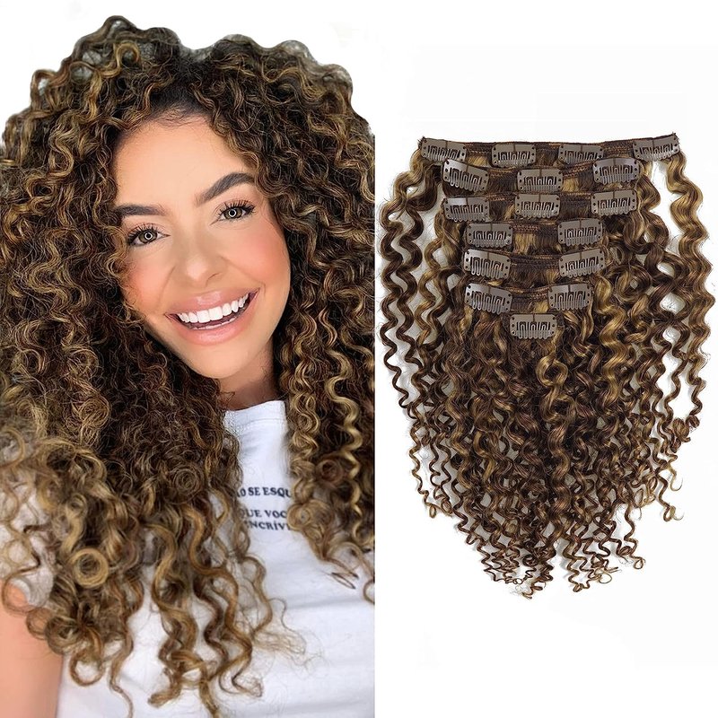 Clip in Human Hair Extensions Afro Jerry Curly 3B 3C Real Hair Clip in Extensions For Black Women Natural Black Color 100% Brazilian African American Hair Extensions (20 inch, Jerry Curly #P4/27)