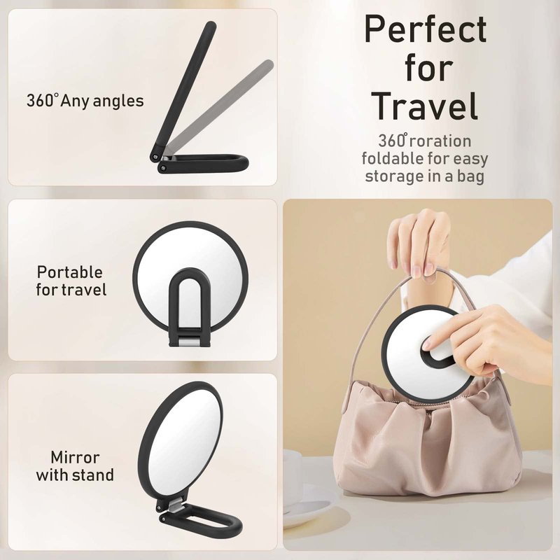 - MUTI-USE DESIGN: Flexible foldaway handle which can rotate multiple angles(with a moderate damping feel), can be used as a hand mirror, tabletop mirror, and hanging mirror.