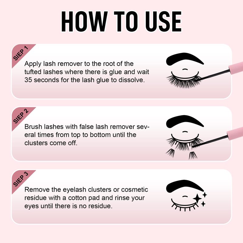 - ✺How to Use: 1: Apply lash remover to the root of the tufted lashes where there is glue and wait 35 seconds for the lash glue to dissolve. 2: Brush lashes with false lash remover several times from top to bottom until the clusters come off. 3: Remove the eyelash clusters or cosmetic residue with a cotton pad and rinse your eyes until there is no residue.