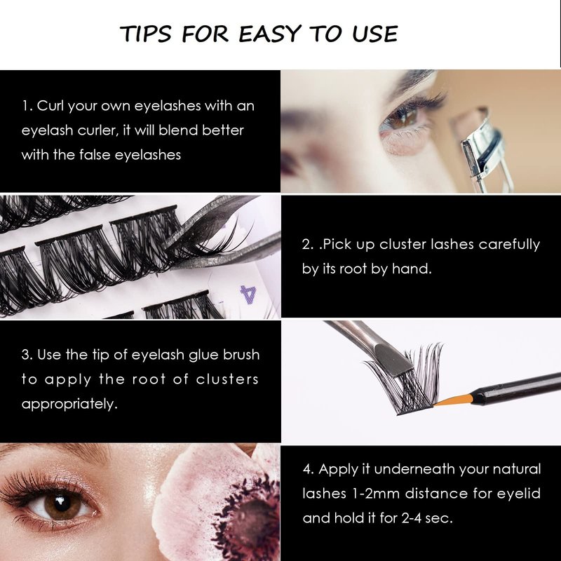- 🌼COMFORTABLE AND NATURAL-LOOKING:These individual lashes are comfortable to wear and hardly noticeable. To apply them, pinch the band of the cluster lash extensions with tweezers and place them below your natural lashes. The mixed-length band of the clusters won't poke your eyelids, ensuring a comfortable wearing experience.