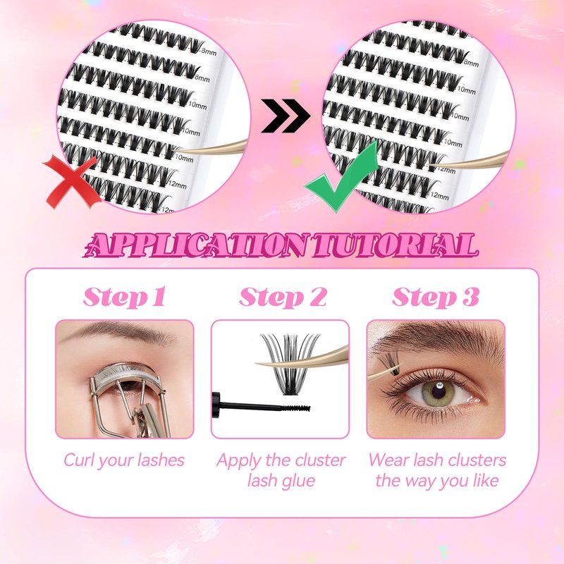 - DIY individual clusters at home: Step 1: Gently curl your lashes. Step 2: Pick up the lash clusters with lash tweezer. Step 3: Apply cluater lash glue. Step 4: Wear cluster lashes according to your preference.