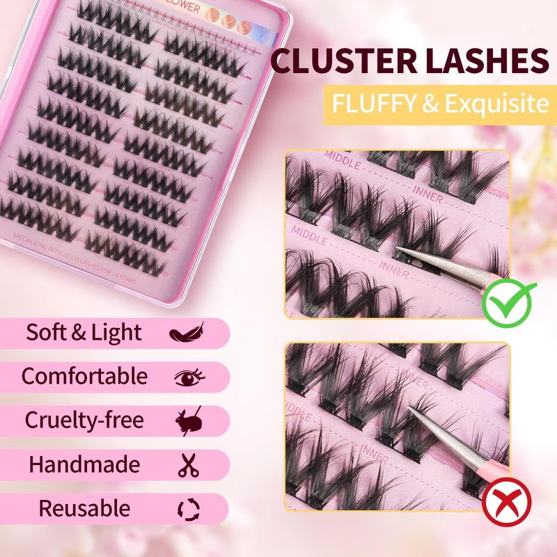 - 【Reusable High-quality Eyelashes】Cluster lashes are made of high-quality PBT synthetic fiber, soft, lightweight and durable. It is safe to wear and does not irritate the eyes, providing you with long-lasting and natural lash clusters. With the right care, they can be used multiple times, making it easy to maintain your perfect look all day.