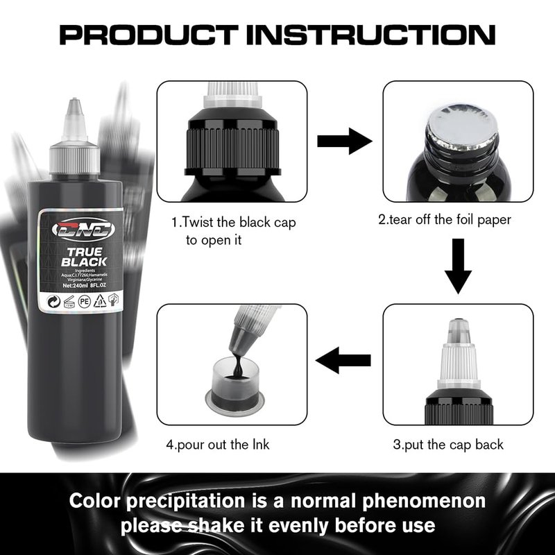 - đź–¤Features: Easy to work with and super opaque, allowing for strong, fast-moving saturation into the skin. Non-irritating and can be used for all tattoo styles.