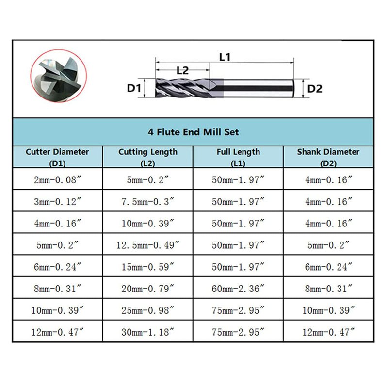 2-12mm End Mill Set: This end mill set includes 8 diameter sizes of 2mm, 3mm, 4mm, 5mm, 6mm, 8mm, 10mm, 12mm, satisfy your different needs.
