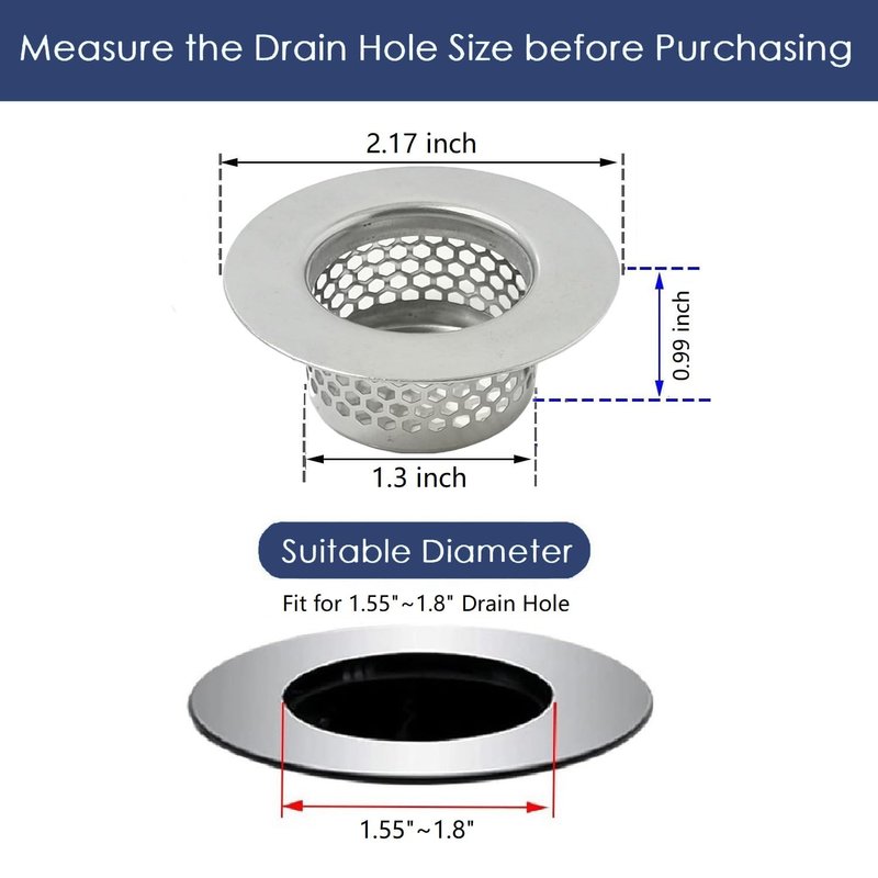 - 【MEASURE the DRAIN HOLE SIZE before PURCHASING】- The bathtub drain strainer fits hole drain with diameter 1.55-1.80inch and depth than 1.0 inch, it is high cylindrical design: Top ø2.17", filter ø 1.3", Depth: 1.0 "