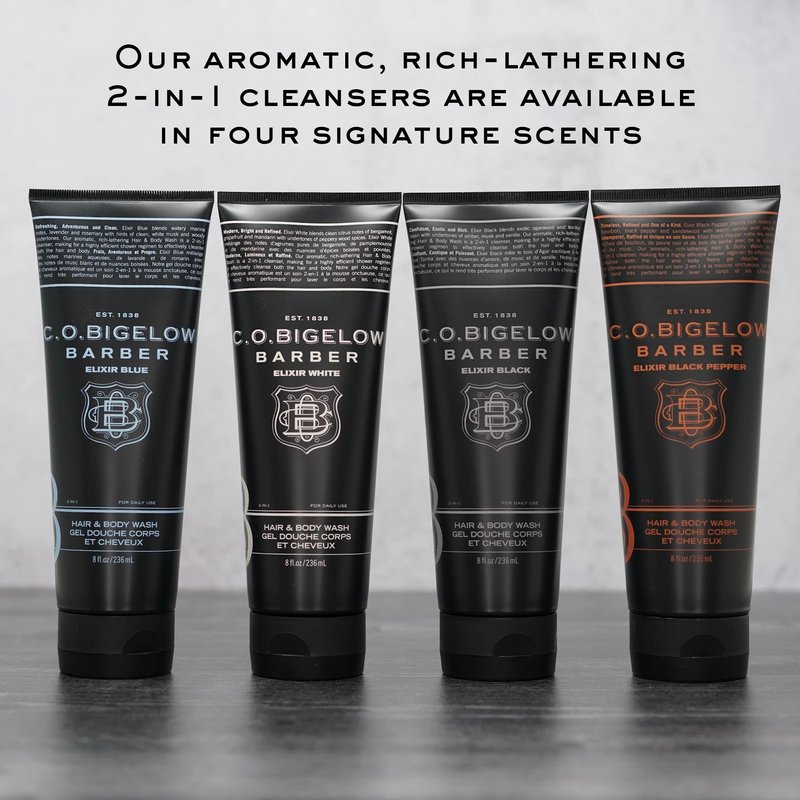 C.O. Bigelow Men's Hair and Body Wash, Elixir Black, No. 1605, 8 fl oz, Mens Body Wash & Shampoo, Musk & Vanilla Moisturizing Mens Shampoo & Body Cleanser, Pack of 2