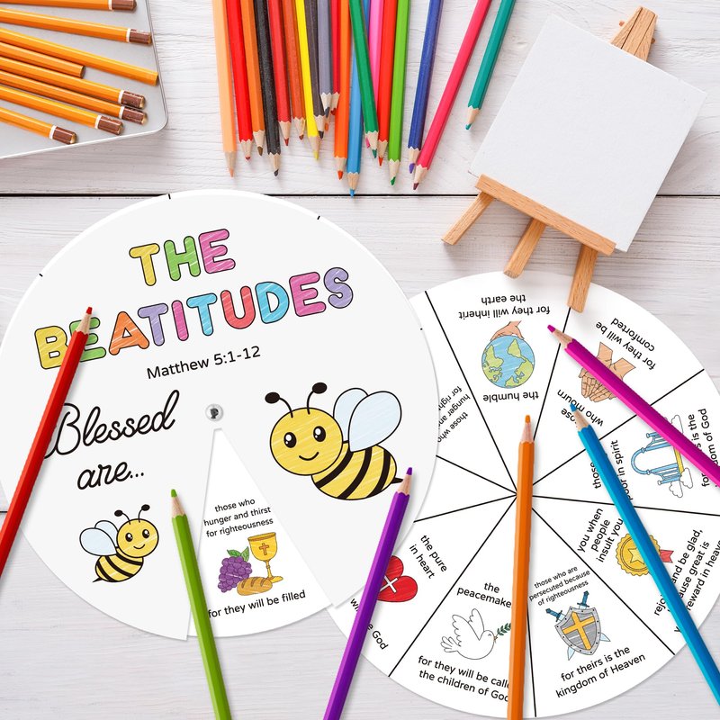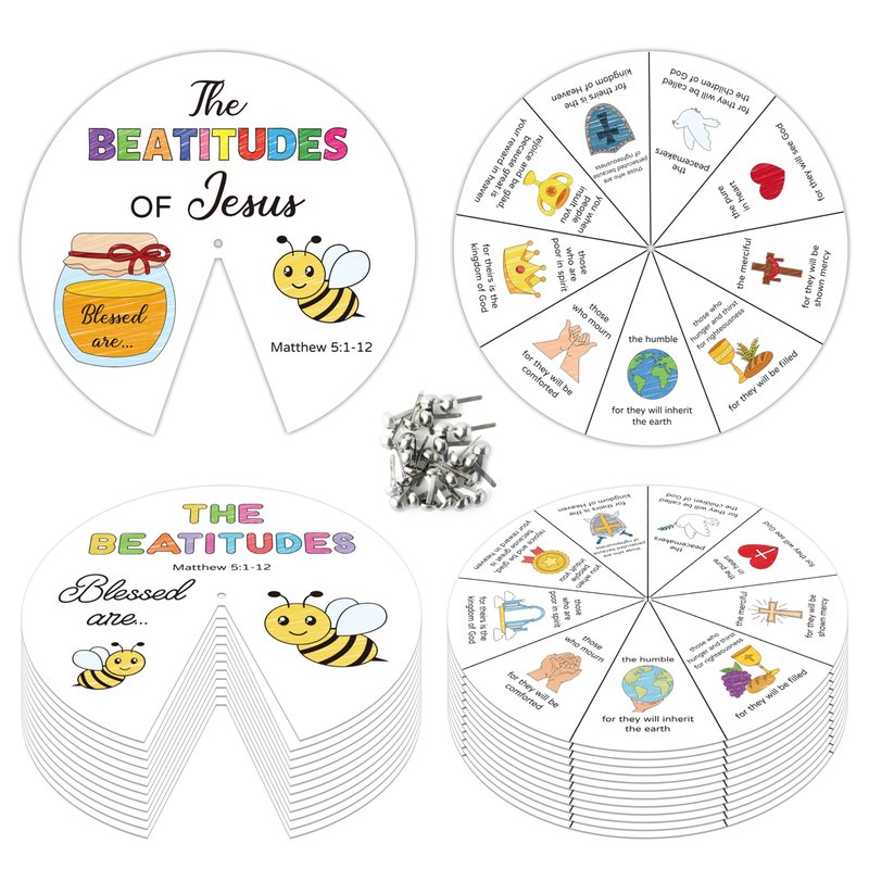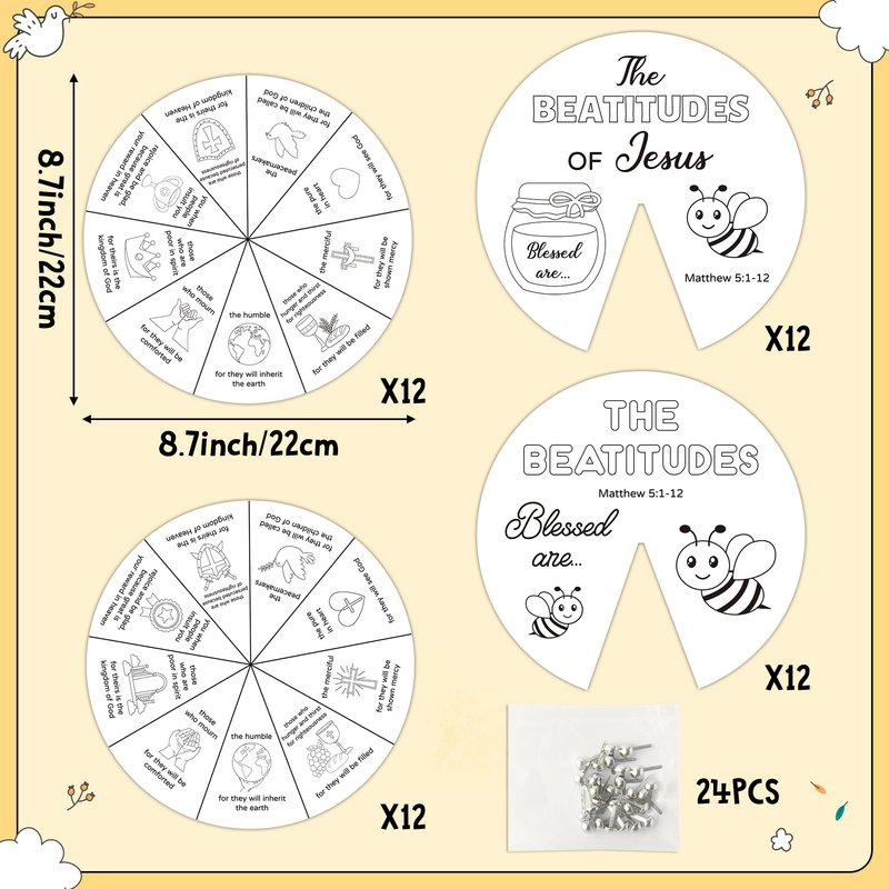 COcnny Religious Coloring Wheel Craft - 24 Sets Beatitudes Christian Craft for Kid, Color Your Own Jesus Art Kit, Biblical Bee DIY Crafts for Sunday School Classroom Church Activities VBS Supplies