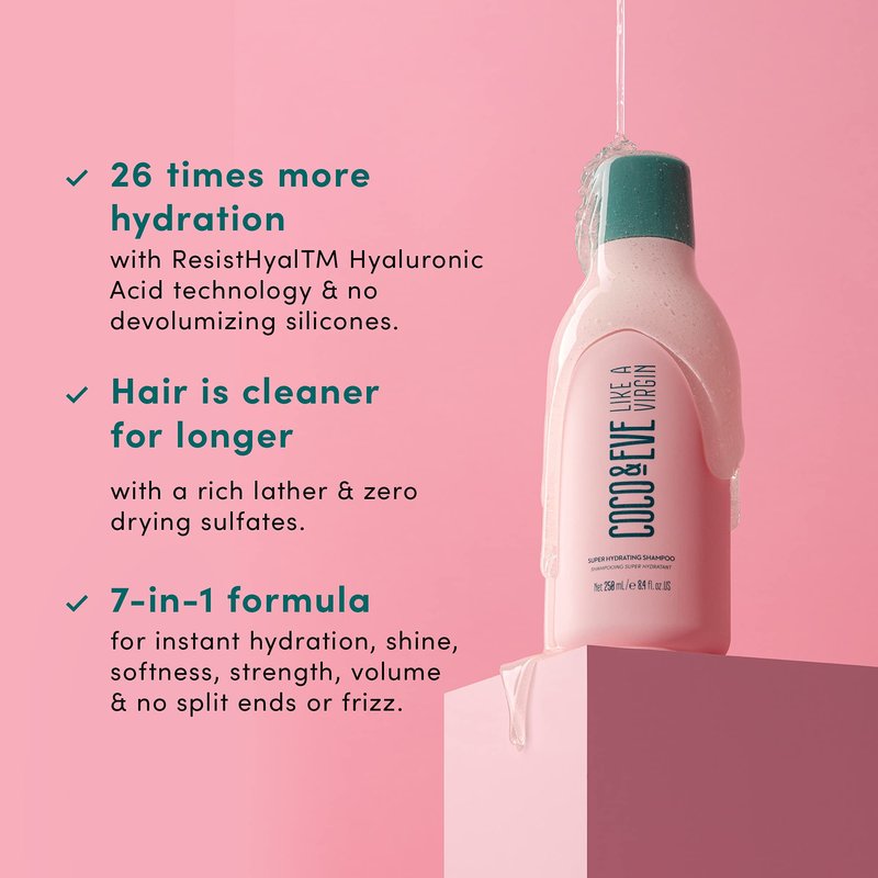 - INSTANTLY HYDRATED, HEALTHIER-LOOKING HAIR. Transform your hair with our Super Hydrating Shampoo, infused with Coconut, Avocado, and ResistHyal technology. This sulfate-free formula significantly boosts moisture, leaving your locks softer, smoother, and glossier. Hyaluronic Acid works to increase hydration by 51%, delivering visible results from the first wash. Perfect for dry, damaged, or color-treated hair, it provides deep hydration without weighing your hair down.