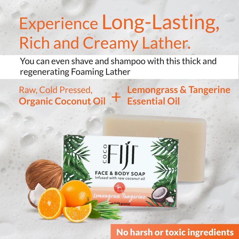 - Ultra Nourishing Recipe : Coco fiji soap for men and women is handcrafted and created using an ancient Fijian recipe. This process is a great way to make Vegan bar soap that is perfect for skin and environment with the ingredients from a sustainable source. Multi-functional this soap does it all, Cleanse, Shave, Shampoo! Our gentle soap pampers and moisturizes the skin with ultra rich-nourishing lather, rinsing off clean without residue and leaving only the fresh scent of Lemongrass Tangerine.
