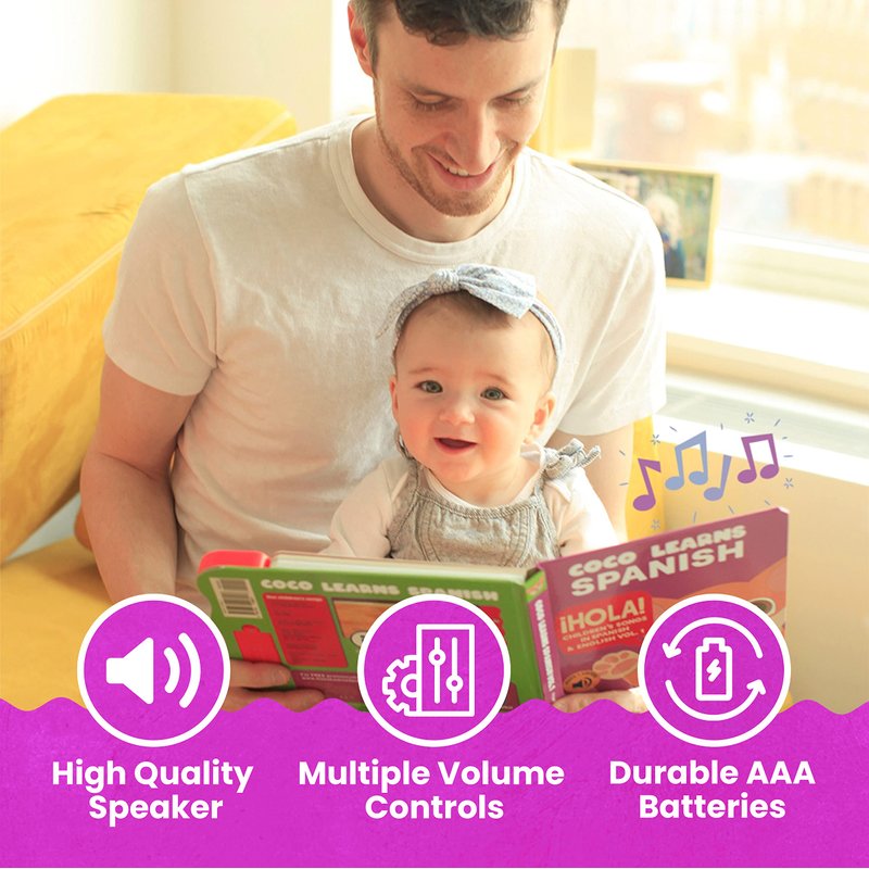 - ❤️ COCO LEARNS SPANISH books are the perfect Spanish Children’s Books for babies, kids, toddlers and children. Our Spanish board books are beautiful, durable and safe. The perfect multicultural toys and bilingual children's books in both English and Spanish. These Spanish musical baby books are a great gift for newborn infants, babies, one year olds, two year olds, three year olds and all toddlers. Non-tearing board book pages. Batteries included. Easy volume controls and mute options.
