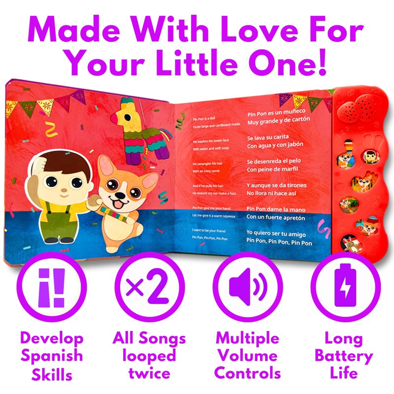 - ❤️ MADE WITH LOVE FOR YOUR BABY. Created by a mom in Brooklyn, NY, these musical toys are the perfect baby books in Spanish. Educational books and learning toys that help kids learn Spanish through music. A great gift for baby showers, moms, dads and birthdays. Los mejores libros de musica en español, juegos musicales para bebes, libros para niños, cuentos infantiles en español and libro en español para niños. Los juguetes perfectos y canciones para niños para los niños. Juegos para niños.