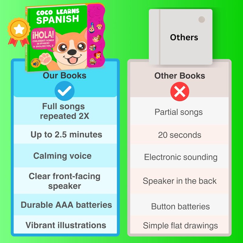 - ❤️ COCO LEARNS SPANISH books are the perfect Spanish Children’s Books for babies, kids, toddlers and children. Our Spanish board books are beautiful, durable and safe. The perfect multicultural toys and bilingual children's books in both English and Spanish. These Spanish musical baby books are a great gift for newborn infants, babies, one year olds, two year olds, three year olds and all toddlers. Non-tearing board book pages. Batteries included. Easy volume controls and mute options.