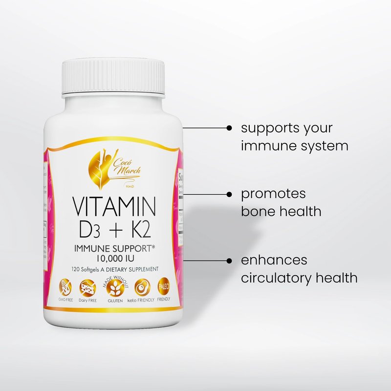 Cocó March N.M.D Vitamin D3+K2 10,000 IU - 4 Month Supply High Potency - Immune & Joint Health Gluten Free, GMO Free, Dairy Free, Keto Friendly, Paleo Friendly, 250 mcg of D3-180 mcg of Vitamin K2