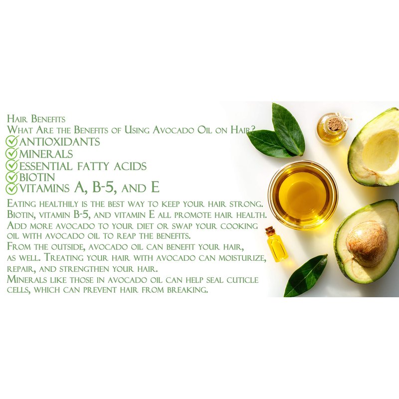 - AVOCADO OIL IS FULL OF VITAMIN E WHICH MAKE IT IDEAL FOR MOISTURIZING AND FEEDING THE SKIN ARE ALSO EXCEPTIONALLY NOURISHING FOR YOUR HAIR. After cleansing your hair, apply avocado oil alone or mixed with your favorite hair- and scalp-friendly essential oils to improve both the appearance and structure of existing hair while at the same time promoting healthier hair.