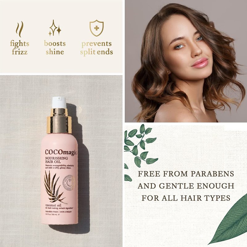- COCOMAGIC NOURISHING HAIR OIL: Infused with coconut oil to help detangle, strengthen & smooth frizzy hair, while preventing against split ends & breakage as it hydrates to restore vibrancy, boost shine and improve manageability. 3 oz.
