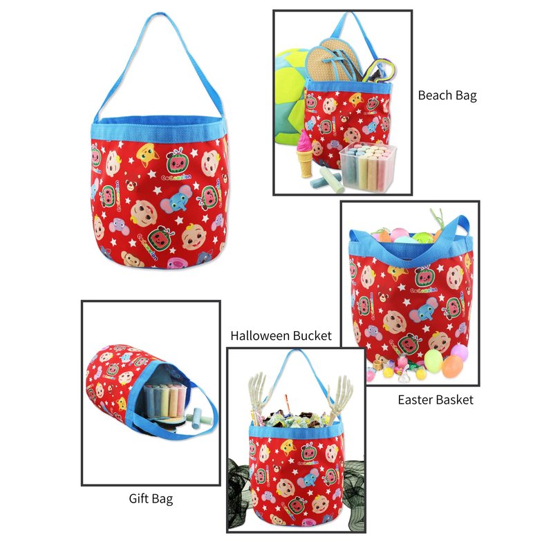 - STURDY AND LIGHTWEIGHT - Our Cocomelon bucket bags are made from nylon for extra durability. These toy bags are extremely lightweight yet strong and are collapsible so they fold up nicely for storage! Kids can use these totes around home! This bag is versatile and can be used to transport toys, a bathing suit, beach towels, flip flops, stuffed animals, candy for Halloween, presents, Easter eggs, personal things, books, arts and crafts, drinks, snacks, trick and treats, and more!