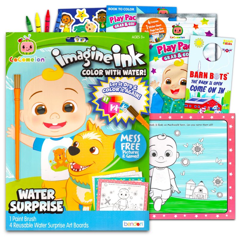 Delight your Cocomelon fan with this Disney paint with water and coloring book super set! Featuring favorite Cocomelon characters and friends! Cocomelon Paint with Water Books for kids and toddlers measure 6 x 8 inches and includes reusable painting pages, activity pages, and 1 water surprise brush. Just dip in water and watch the pages come to life, let it dry, then color again and again. Reusable and mess free painting for toddlers and kids. Cocomelon Water Surprise books are perfect for first-time artists. Includes 1 deluxe no mess Cocomelon paint with water book for kids and 1 Cocomelon coloring book with stickers. The sturdy painting pages are reusable -- just let them dry and use over and over again. Endless painting fun! With this water painting kit children paint and color their favorite Cocomelon characters using only water! Provides hours of mess-free painting fun. Great gift for your favorite Cocomelon enthusiast! Perfect as Cocomelon party supplies and party activities. Officially licensed Cocomelon coloring set for kids -- boys and girls alike. Set includes bonus Barn Bots Door Hanger.