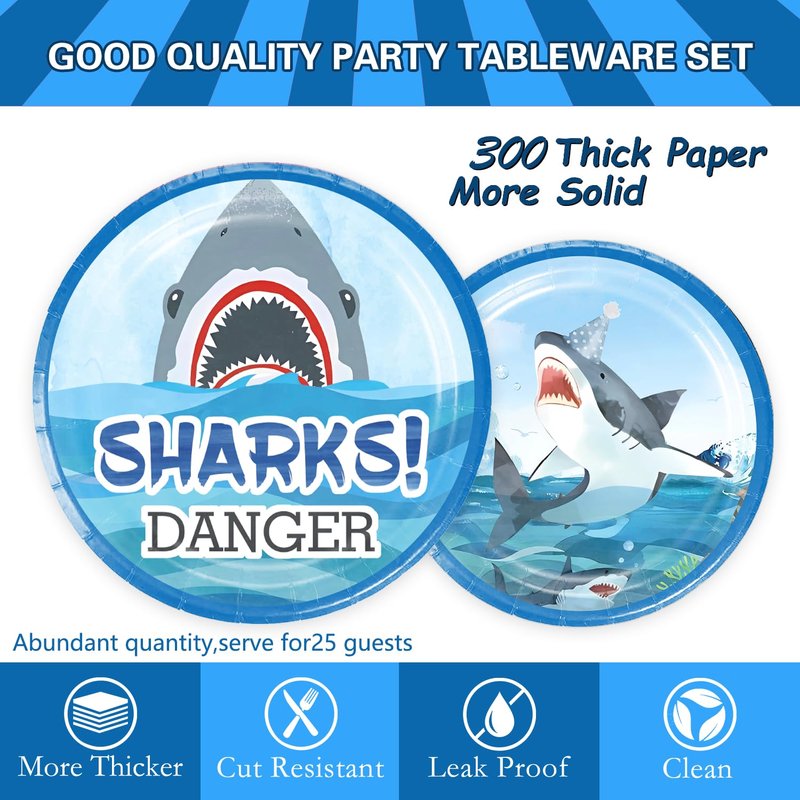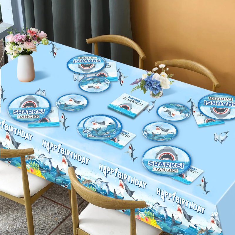 - Save Your Time: This shark theme birthday party decorations are All-in-One Pack , includes shark theme plates, cups, napkins, straws, tablecloth, knives, forks, banner. You can easily assemble them and spend more time with your family and friends