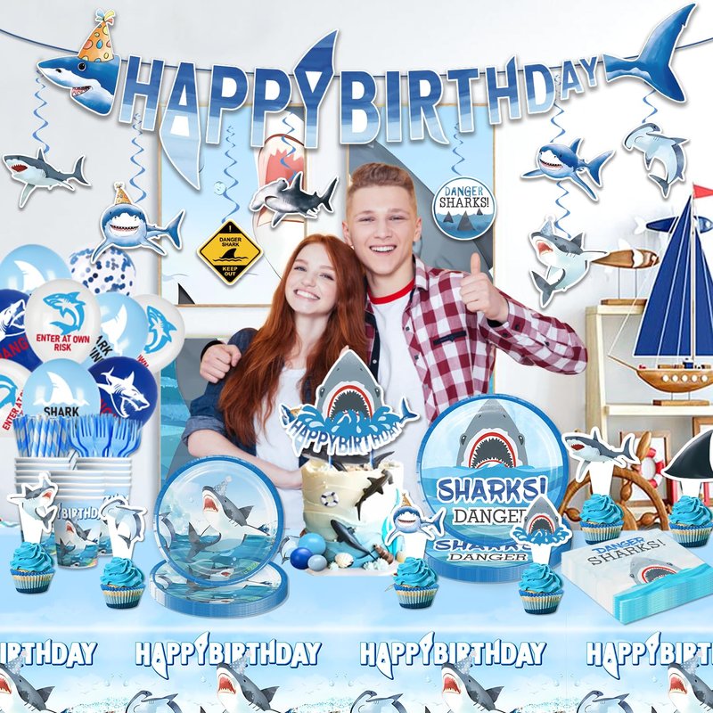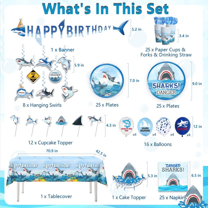 - Package Includes: You will receive 197 pieces of shark birthday party decorations, include 1 x banner, 1 x tablecloth, 8 x paper card, double-sided printing, 8 x hanging swirl, 16 x balloons, 1 x cake topper, 12 x cupcake toppers, a set of tableware for 25 guests, including 9 inch plates, 7 inch plates, forks, straws, napkins and cups, Our shark birthday decorations set enhances the party atmosphere and creates an unforgettable memory for your friends and family