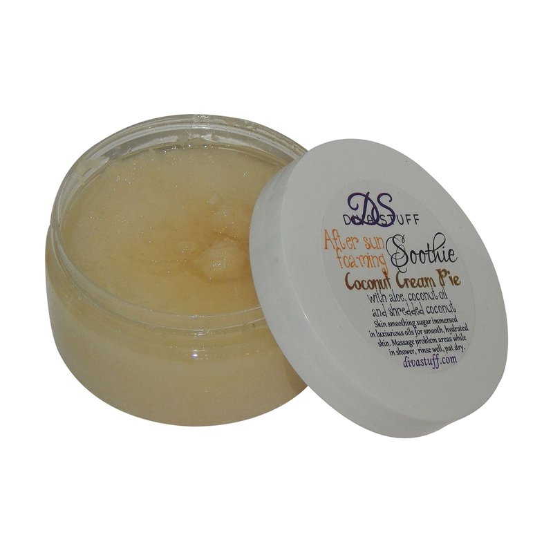 Coconut Cream Pie Scent Foaming Sugar Scrub. Great for pre and post sun bathing sessions. Loaded with nourishing oils and actual shredded coconut. Massage over body in the shower and then rinse clean. The oils will leave your skin feeling soft and smooth. Comes in an 8 ounce jar. These statements have not been evaluated by the FDA, and this product is not intended to diagnose, treat or cure any disease.