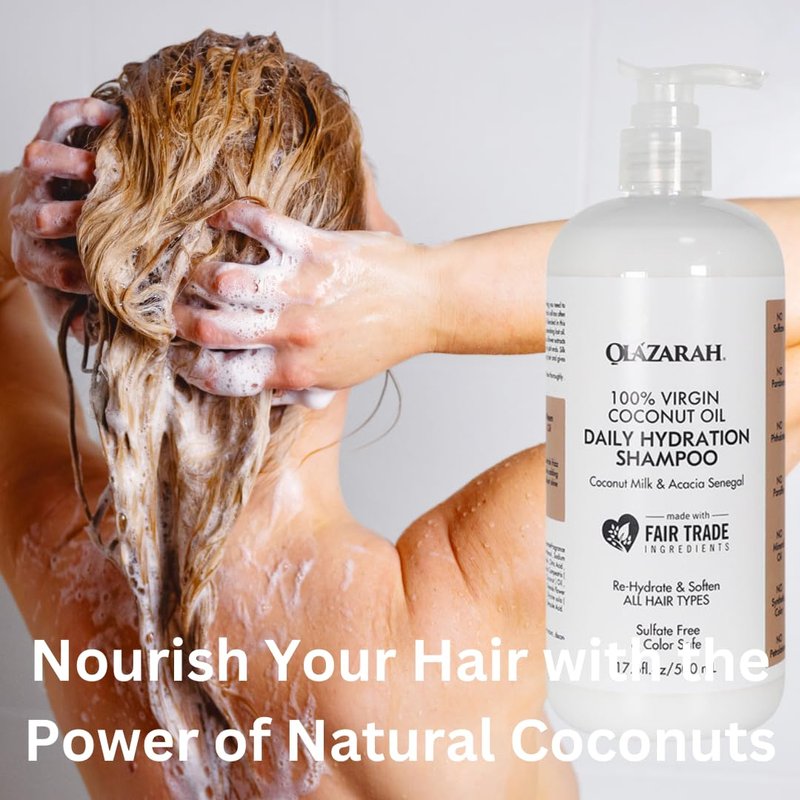 The combination of our daily hydration shampoo and coconut oil conditioner will take away impurities, soften, and rehydrate hair to be the best with gentle, nourishing, sulfate free shampoo. Suitable for all hair types and textures, this moisturizing shampoo strengthens and hydrates hair, leaving it looking glowing, healthy and beautiful OlaZarah Daily Hydration Shampoo can be used daily to cleanse and restore parched hair. It is blended and infused with coconut oil, coconut milk, and Acacia Senegal, helps provide renewed hydration, add luster, manageability, shines, moisture, and softness to hair for smooth and healthy-looking hair.